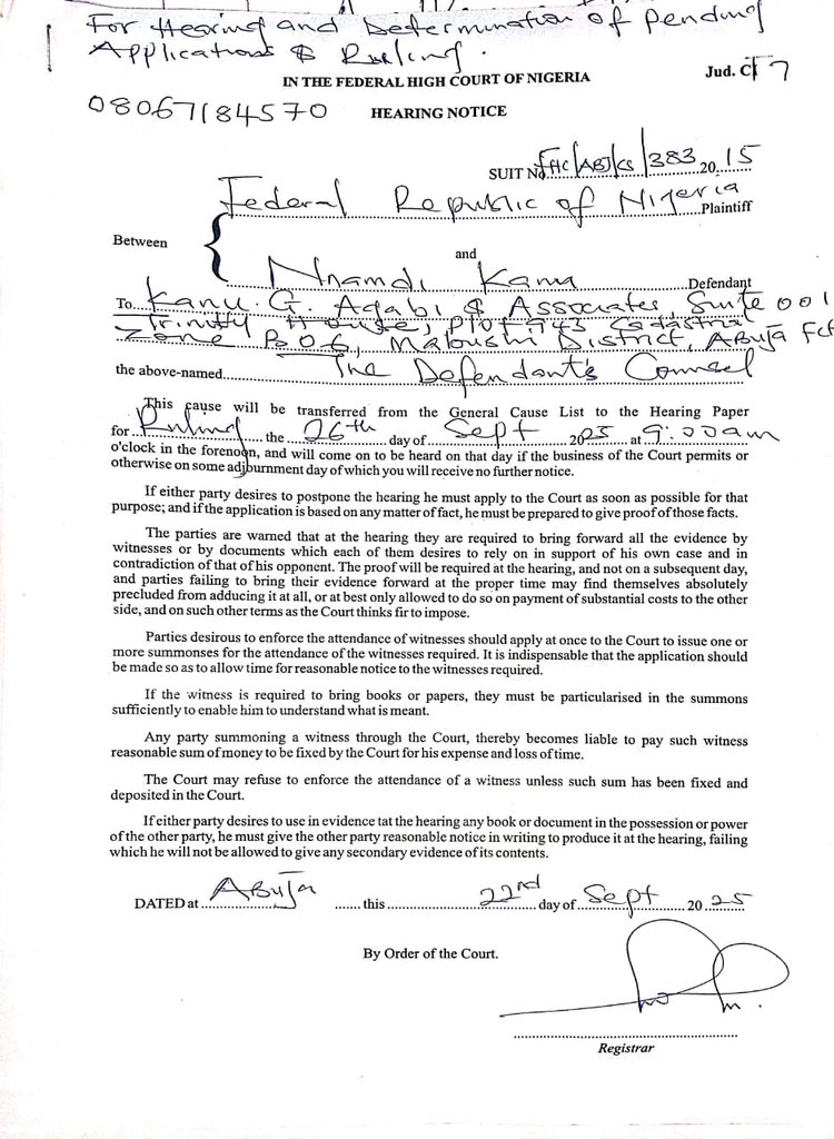 The Federal High Court in Abuja has moved the next stage of Mazi Nnamdi Kanu’s trial from 10 October to 26 September 2025 to deliver its ruling on the defence’s no-case submission, a motion arguing that the prosecution has failed to present any evidence warranting further trial.