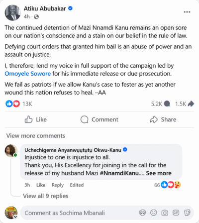 “The continued detention of Mazi Nnamdi Kanu remains an open sore on our nation’s conscience and a stain on our belief in the rule of law,” Atiku declared. “Defying court orders that granted him bail is an abuse of power and an assault on justice. I, therefore, lend my voice in full support of the campaign led by Omoyele Sowore for his immediate release or due prosecution.”