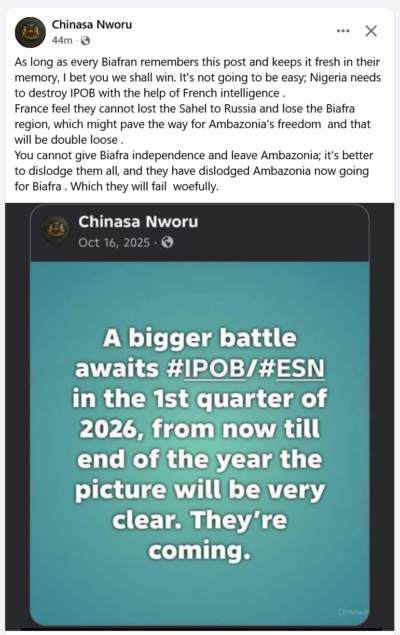 In his latest statement, Nworu urged supporters to revisit an earlier message he published on October 16, 2025, where he warned that “a bigger battle awaits IPOB/ESN in the 1st quarter of 2026,” adding at the time: “From now till end of the year the picture will be very clear. They’re coming.”