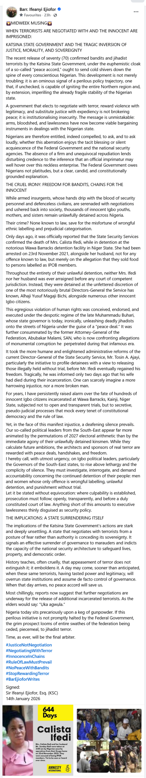 Prominent human rights lawyer and constitutional advocate, Barrister Ifeanyi Ejiofor, has delivered a scathing indictment of Nigeria’s security and justice architecture following the controversial release of 70 suspected Fulani bandits and jihadist terrorists by the Katsina State Government, despite widespread public outrage and rejection by Nigerians.