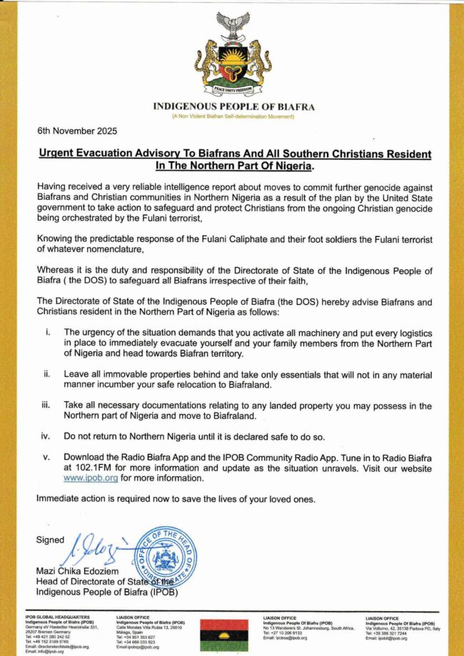 IPOB reaffirmed its commitment to the protection of Biafran lives, insisting that early evacuation remains the most prudent step in light of the “credible and imminent threat” against Christian populations in Northern Nigeria.