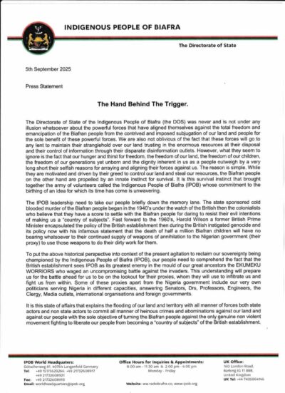 The Directorate of State (DOS) of the Indigenous People of Biafra (IPOB) has issued a strong statement reaffirming its commitment to the struggle for Biafra’s freedom, stressing that powerful external forces have long aligned with Nigeria to maintain control over Biafra’s resources and people. The DOS recalled the British-sponsored killings of Biafrans dating back to the 1940s and the genocide of the late 1960s, warning that current efforts are part of a historical continuum designed to keep Biafrans as “a country of subjects.”