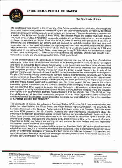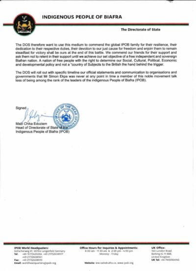The Directorate of State want to restate that the Indigenous People of Biafra (IPOB) is a global movement with defined structures; it is a movement with identifiable institutions. IPOB is a self determination movement guided by fundamental ideological principles with inbuilt checks and balances to prevent both members and agent provocateurs from hijacking and derailing or deviating from our core fundamental objective of a peaceful Self Determination for the Biafran people.