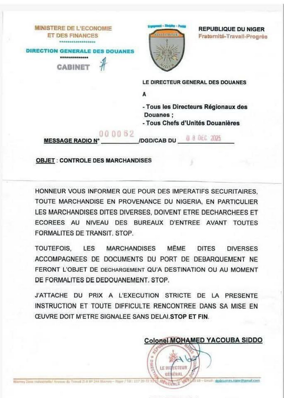 This instruction, addressed to all Regional Directors and Unit Chiefs of Customs, represents an immediate and binding order across every controlled entry point into Niger.