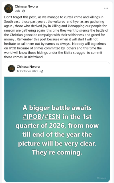 In a subsequent social media post, Nworu revisited a warning he issued in 2025, predicting that a “bigger battle” awaited IPOB and the Eastern Security Network (ESN) in the first quarter of 2026.