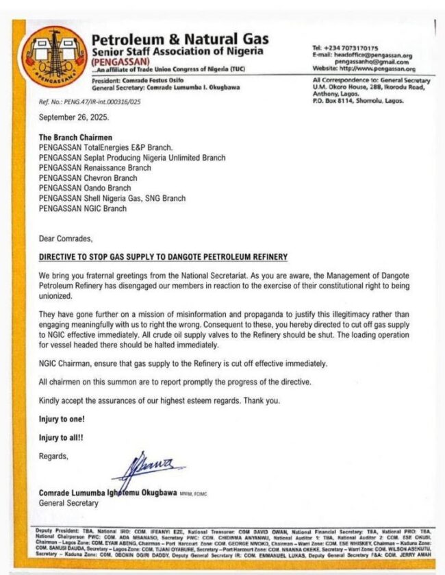 In a directive signed by General Secretary Comrade Lumumba Ighotemu Okugbawa and circulated to PENGASSAN branches at TotalEnergies, Seplat, Renaissance, Chevron, Oando, Shell Nigeria Gas, and the Nigerian Gas Infrastructure Company (NGIC), the union condemned the refinery’s reported dismissal of workers seeking to unionize.