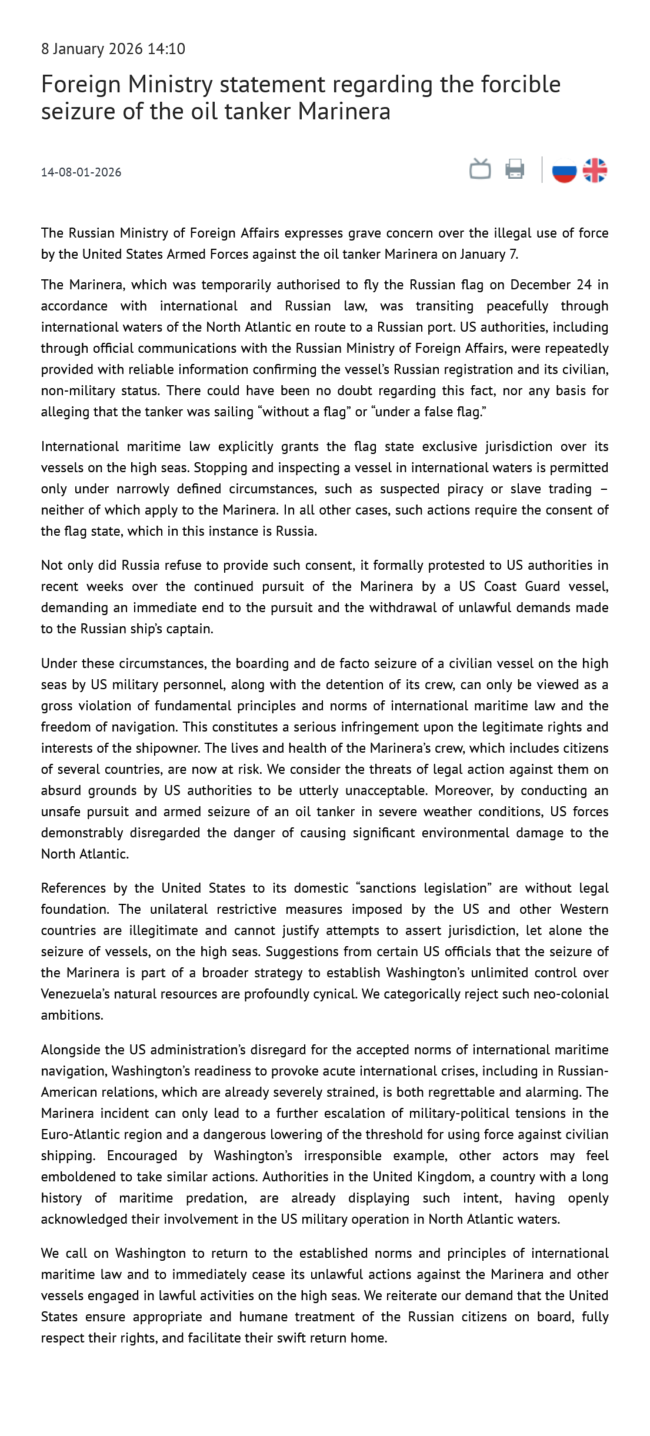 The Foreign Ministry concluded by calling on the United States to immediately cease all unlawful actions against the Marinera and other civilian vessels operating legally on the high seas.