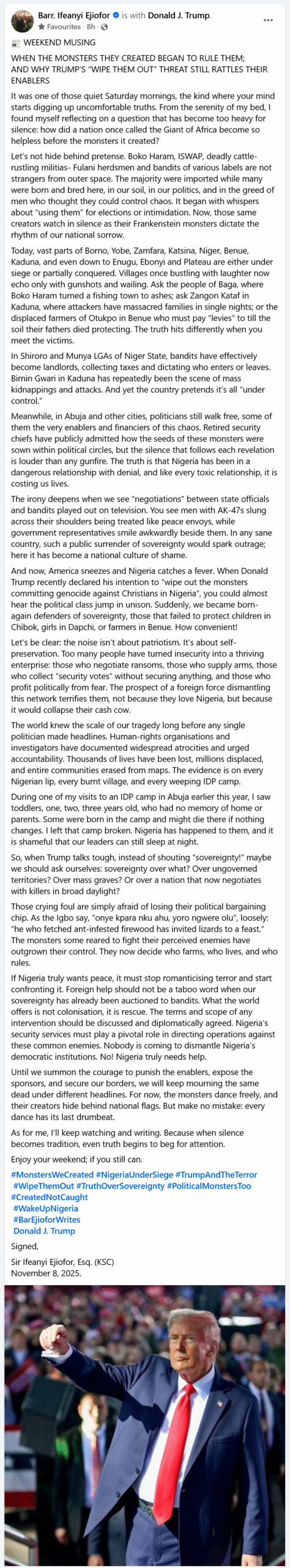In a powerful weekend reflection titled “When the Monsters They Created Began to Rule Them,” human rights lawyer Barrister Ifeanyi Ejiofor condemned Nigeria’s ruling class for breeding and enabling the terror groups now holding the country hostage.