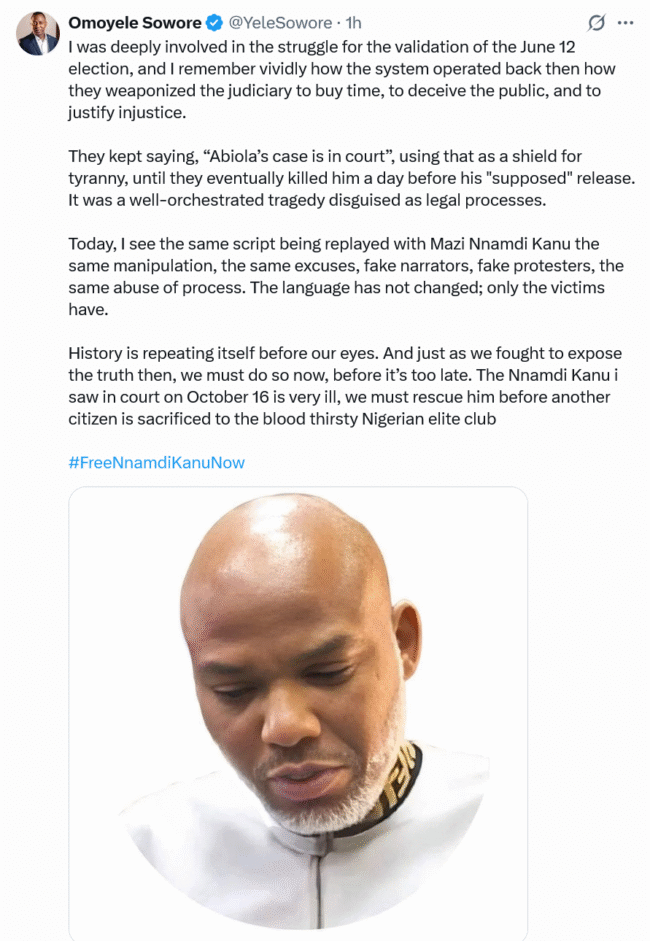 “You kept saying, ‘Abiola’s case is in court’ using that as a shield for tyranny, until they eventually killed him a day before his ‘supposed’ release,” Sowore wrote. “History is repeating itself before our eyes. The Nnamdi Kanu I saw in court on October 16 is very ill; we must rescue him before another citizen is sacrificed to the blood-thirsty Nigerian elite club.”