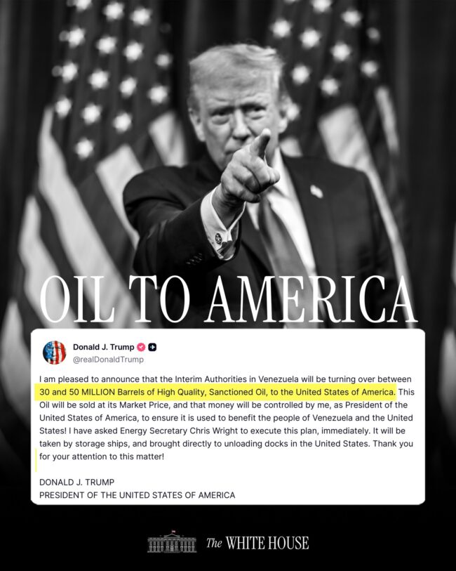 “I am pleased to announce that the Interim Authorities in Venezuela will be turning over between 30 and 50 MILLION Barrels of High Quality, Sanctioned Oil, to the United States of America.”